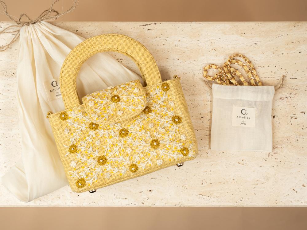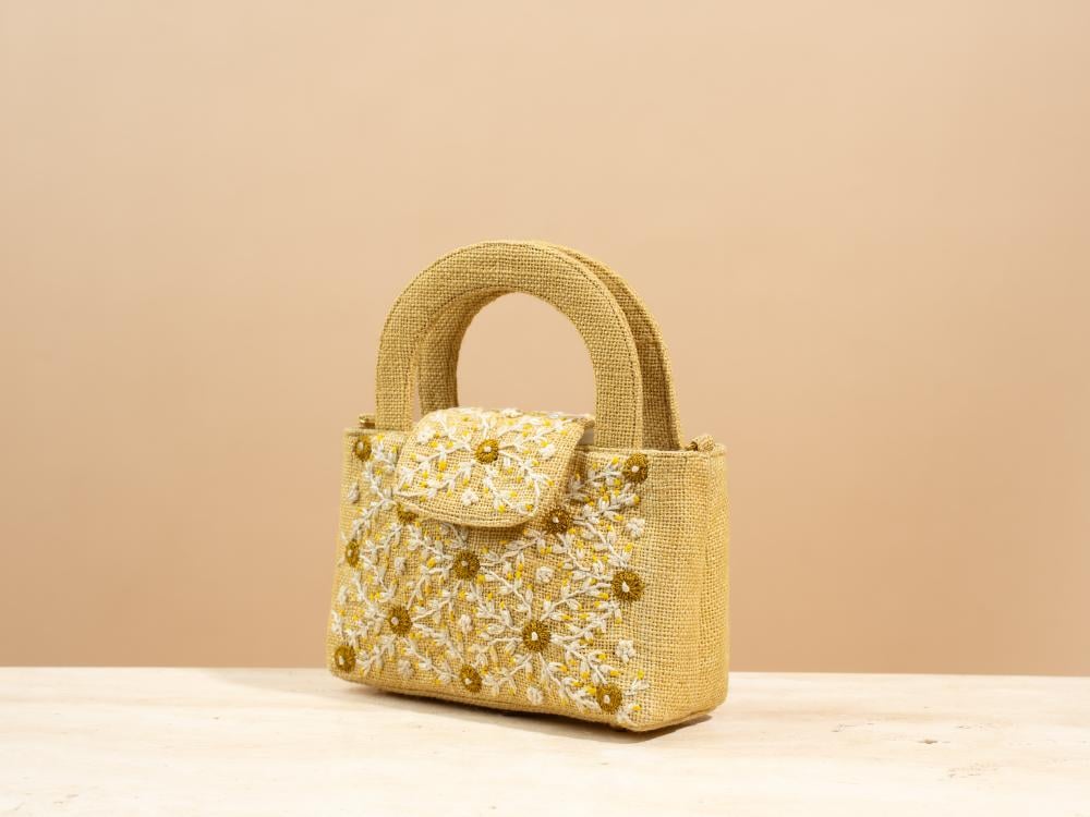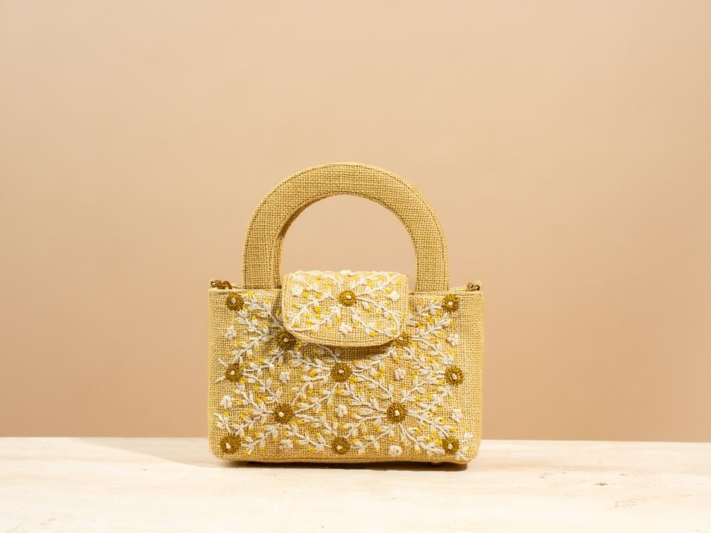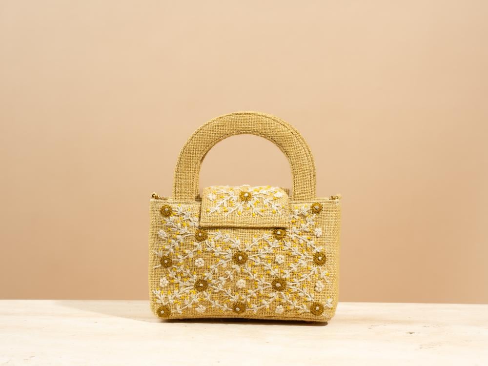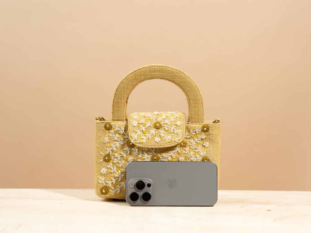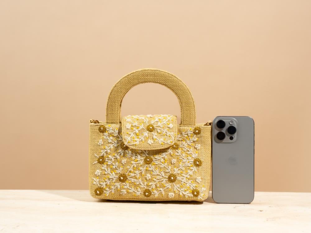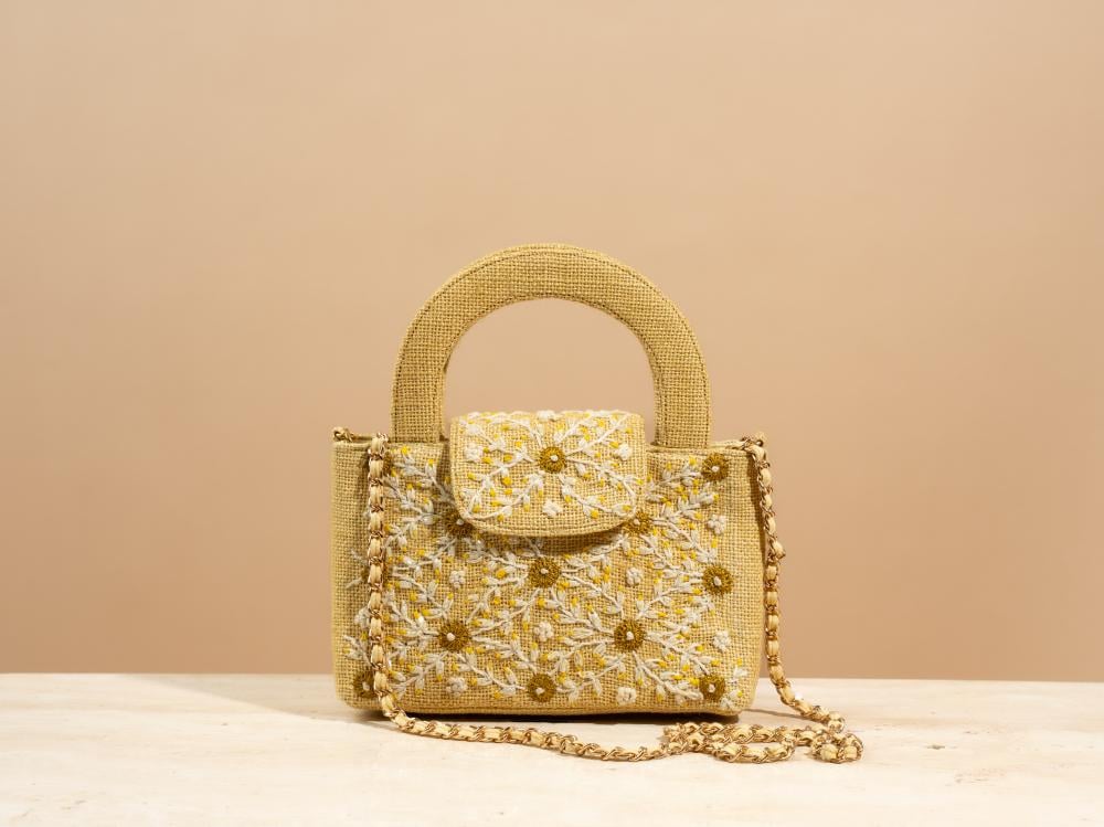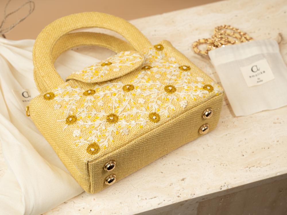 كأنها نسمة دافئة من الأناقة تهب في صيف هادئ، تأتي هذه الحقيبة بلون الزبدة الناعم لتجسد بساطة الطبيعة وفخامة التفاصيل. مصنوعة يدويًا من الجوت الطبيعي المتداخل برقة مع سلسلة معدنية، لتروي حكاية توازن بين الخامة الخام واللمسة الراقية تزدان بزهور مطرزة بدقة بلون أعمق من الزبدة، تنبض بالحياة كأنها تنمو على أرض هادئة، بينما تتسلل أوراق الشجر البيضاء بخفة حولها، كما لو أنها تهمس بأسرار الربيع. كل غرزة تحكي قصة من الصبر والإبداع، وكل تفصيله تنبض بالحرفية العالية يكتمل جمالها بقفل معدني أنيق يحفظ محتوياتك بأمان وأناقة، بينما تمنحك السلسلة القابلة للارتداء على الكتف أو في اليد حرية التنقل بأسلوبك الخاص. ليست مجرد حقيبة، بل قصيدة تُحمل بين يديك