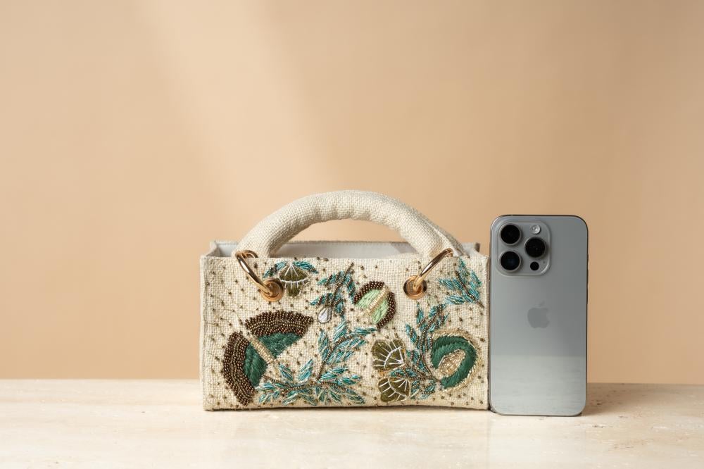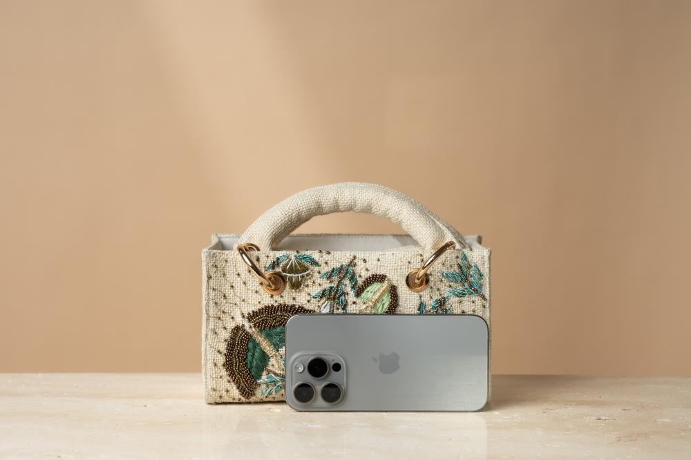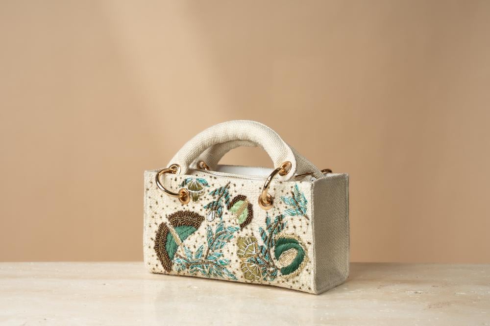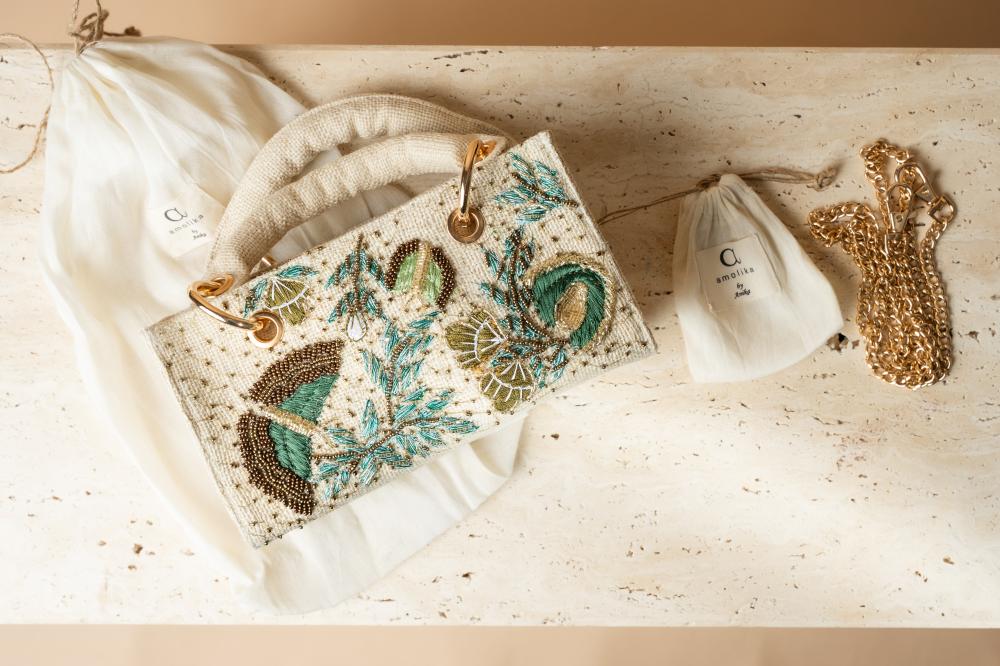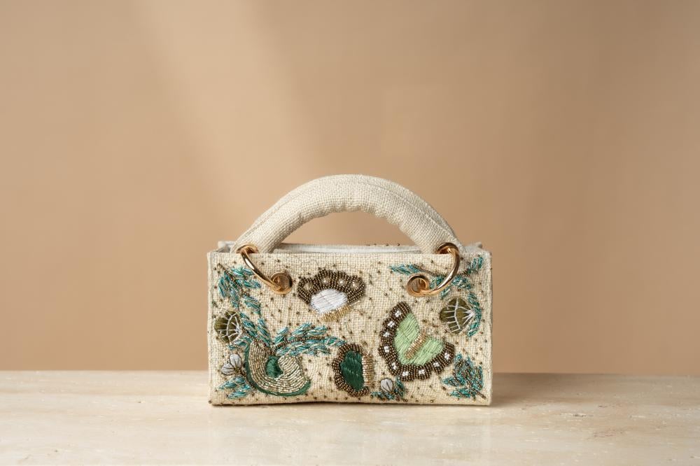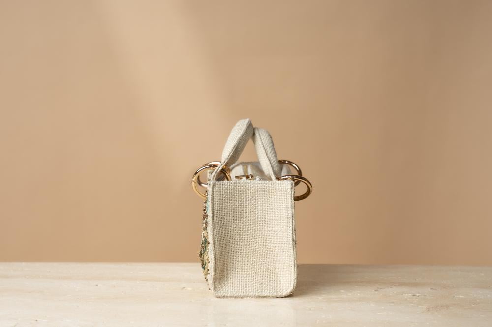 مصممة يدويًا بإتقان لتعكس الجمال والفخامة في كل تفصيله. تتميز بتصميم مستطيل أنيق من خامات راقية باللون الأبيض العاجي، يزينها تطريز معقد مستوحى من الفراشات والزخارف الطبيعية، تتداخل الخيوط البترولية والذهبية بتناغم فريد تكتمل روعة الحقيبة بمقبض مغطى بالقماش الفاخر، مع حلقات معدنية ذهبية تضيف لمسة من التميز. كما أنها مزودة بسحاب أنيق يحافظ على المحتويات بأمان، بالإضافة إلى سلسلة قابلة للفصل تمنحك حرية الاختيار بين حملها باليد أو تعليقها على الكتف لمزيد من الراحة والعملية.