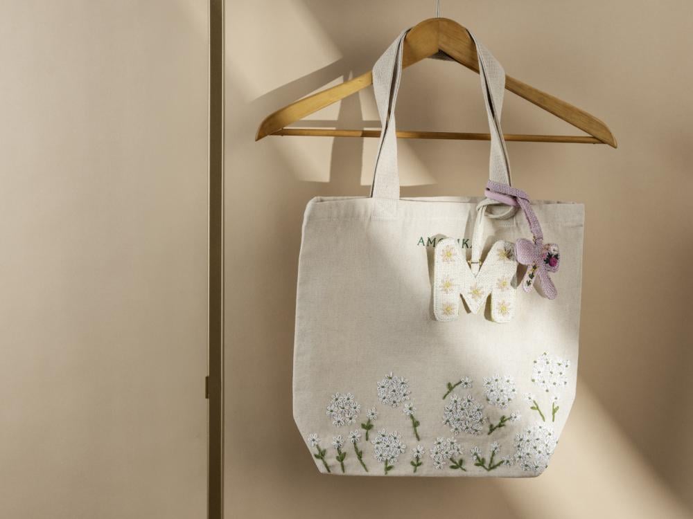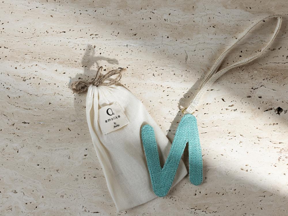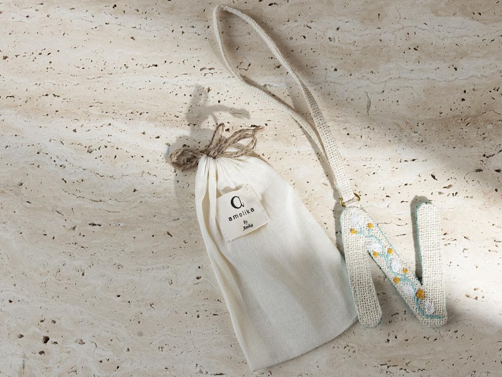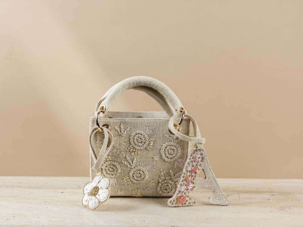 الفابتك تشارمز من الجوت مع حزام كلاسيكي من الجوت مطرز يدويًا بالحب. يمكن ربطها بأي حقيبة وهي مثالية لتقديمها كهدية.