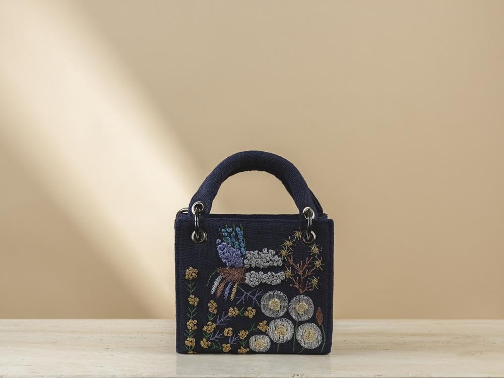 اندفاعة من الإبداع والكثير من الحب حقيبة الجوت الصغيرة الصغيرة ذات اللون الأزرق في منتصف الليل التي أنشأتها الحرفيات لدينا والمصممة بخيال فريد من الزهور الفضية وحب الطبيعة ستجلب بالتأكيد ابتسامة على وجهك وقلبك. تأتي الحقيبة مع مقبض حمل ، حبال قابلة للفصل ، جيب داخلي وزر إغلاق.