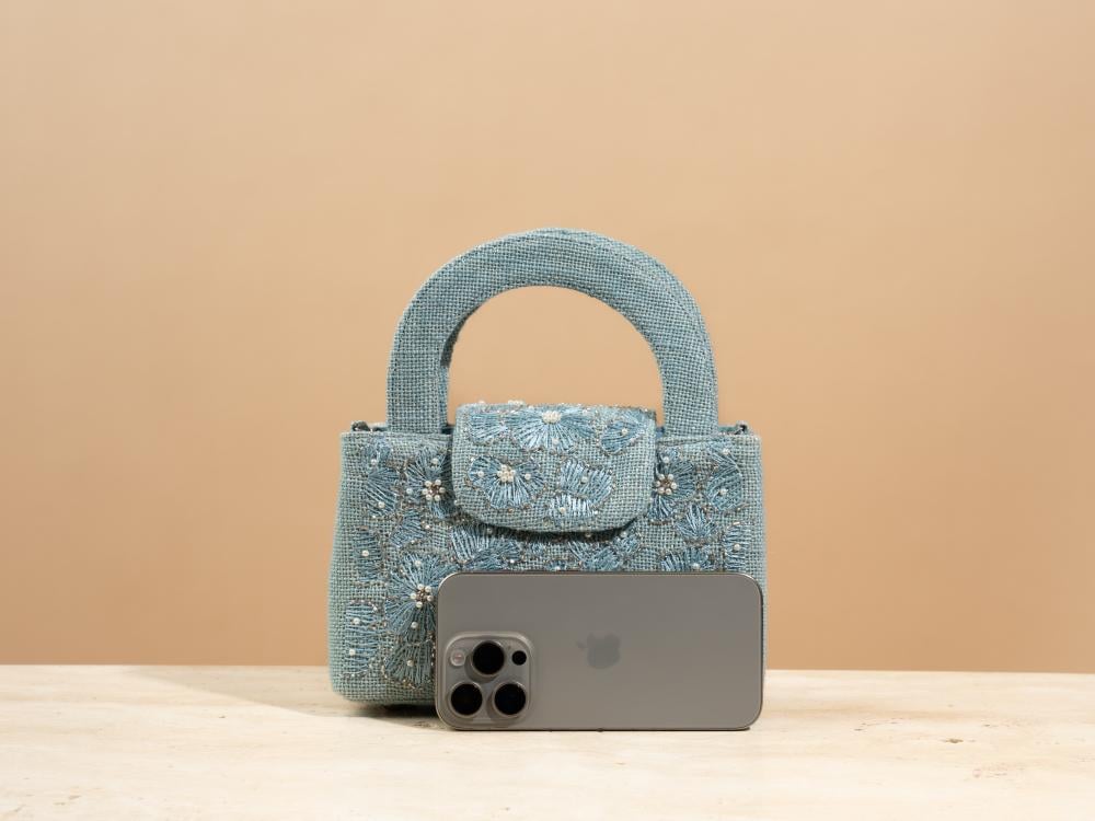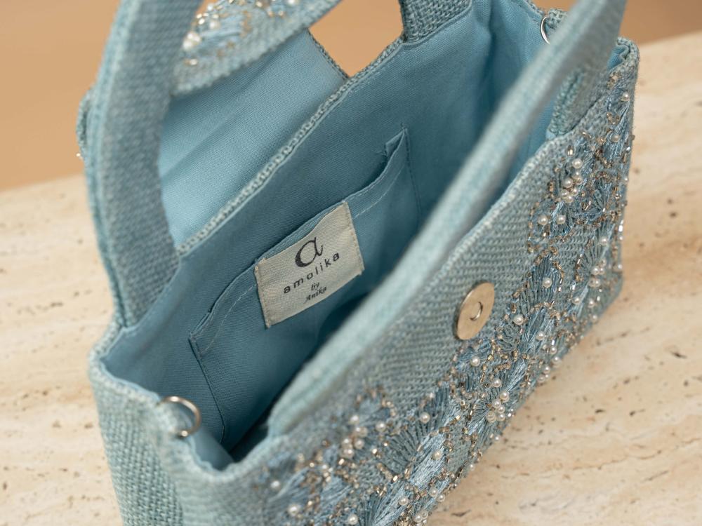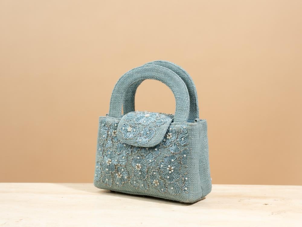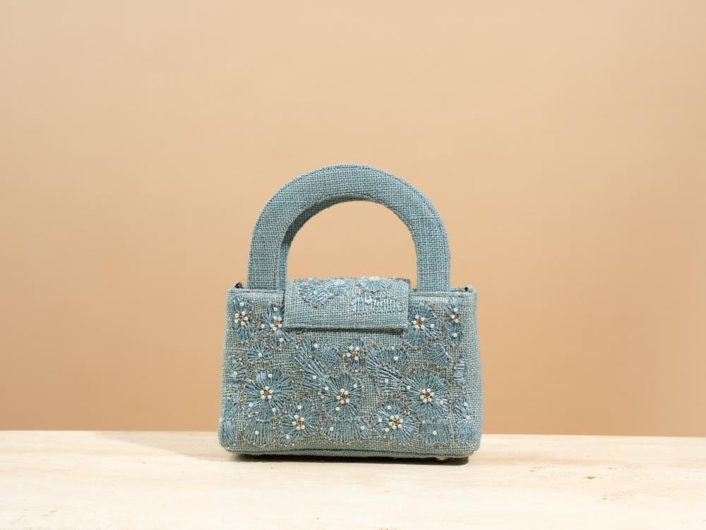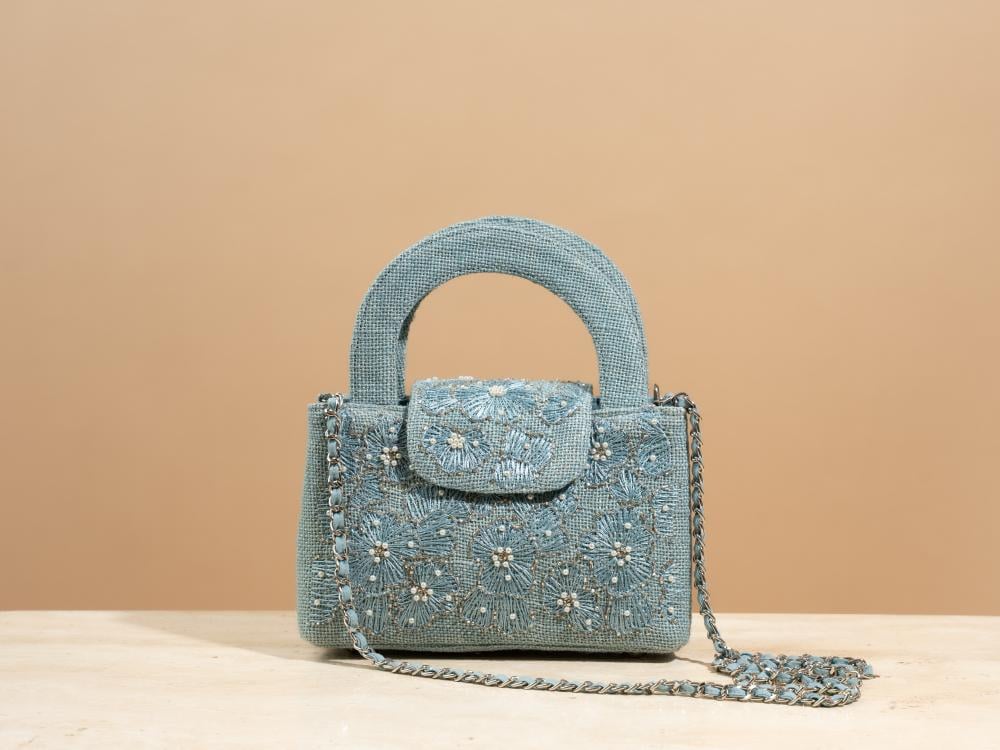 A touch of elegance to elevate your look—this bag arrives in a deep blueberry hue, echoing the charm of velvet midnight skies. Hand-embroidered with same-tone florals, it feels as if threads of longing have been etched into a canvas of calm. Carefully crafted from natural jute and thoughtfully combined with a soft metallic chain wrapped in Indian cotton, it creates a beautiful contrast between organic texture and subtle shine.