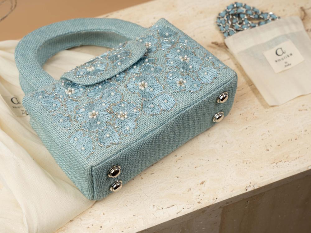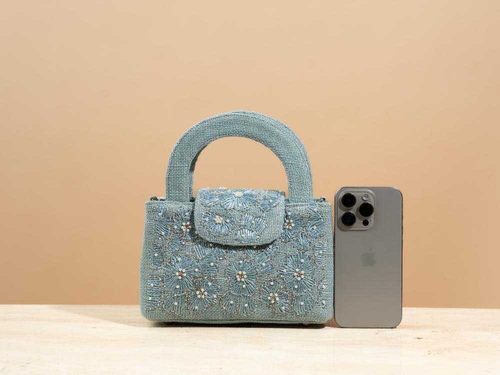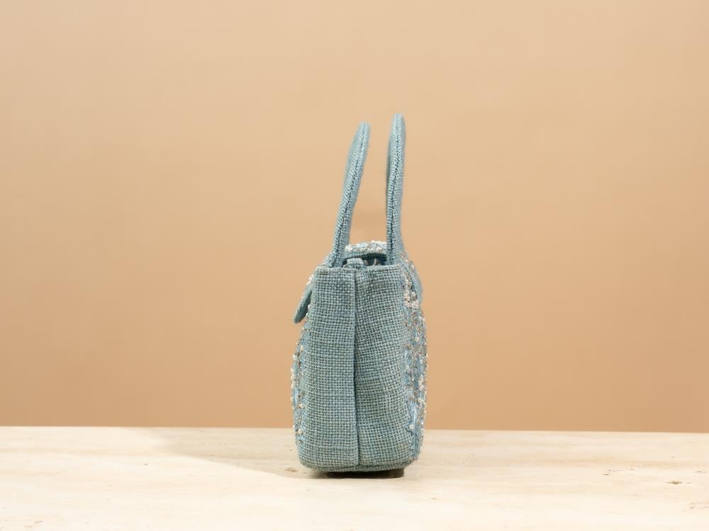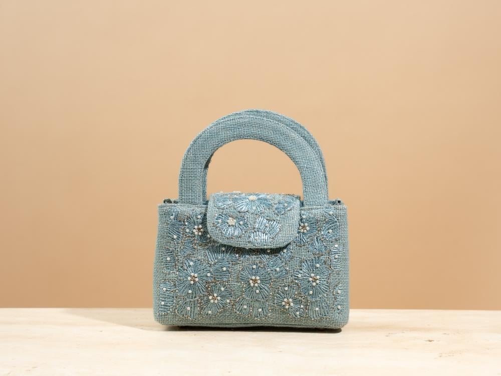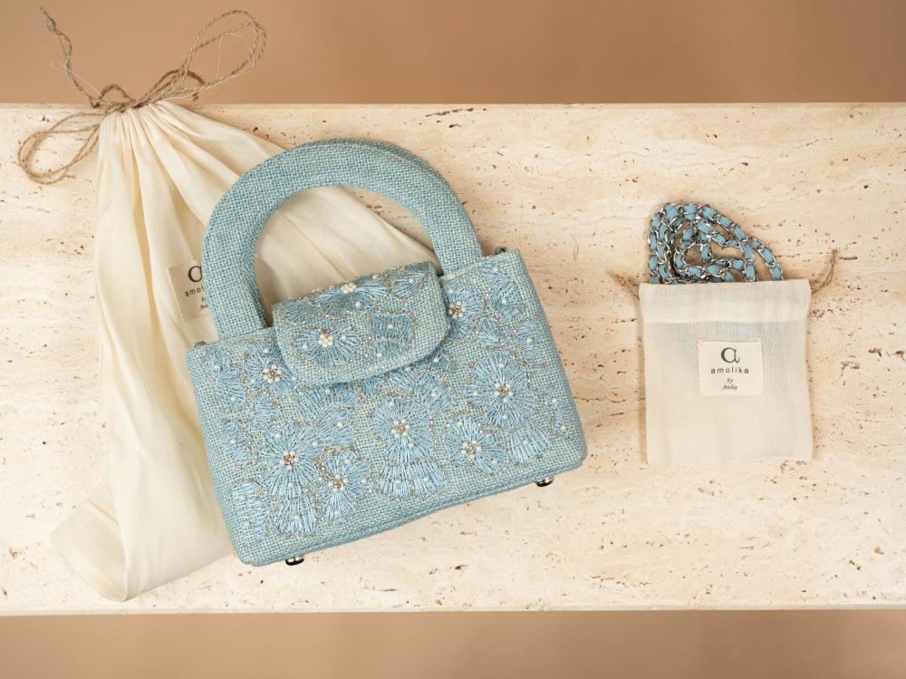 A touch of elegance to elevate your look—this bag arrives in a deep blueberry hue, echoing the charm of velvet midnight skies. Hand-embroidered with same-tone florals, it feels as if threads of longing have been etched into a canvas of calm. Carefully crafted from natural jute and thoughtfully combined with a soft metallic chain wrapped in Indian cotton, it creates a beautiful contrast between organic texture and subtle shine.